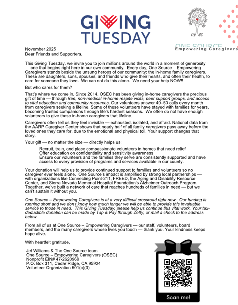 One Source-Empowering Caregivers is participating the GLOBAL DAY OF GIVING. This movement unleashes the power of world generosity and reimagines the gift of shared humanity. The common mission of Giving Tuesday is to build a world where generosity is part of everyday life. Everyone has something to give; every act of generosity counts.